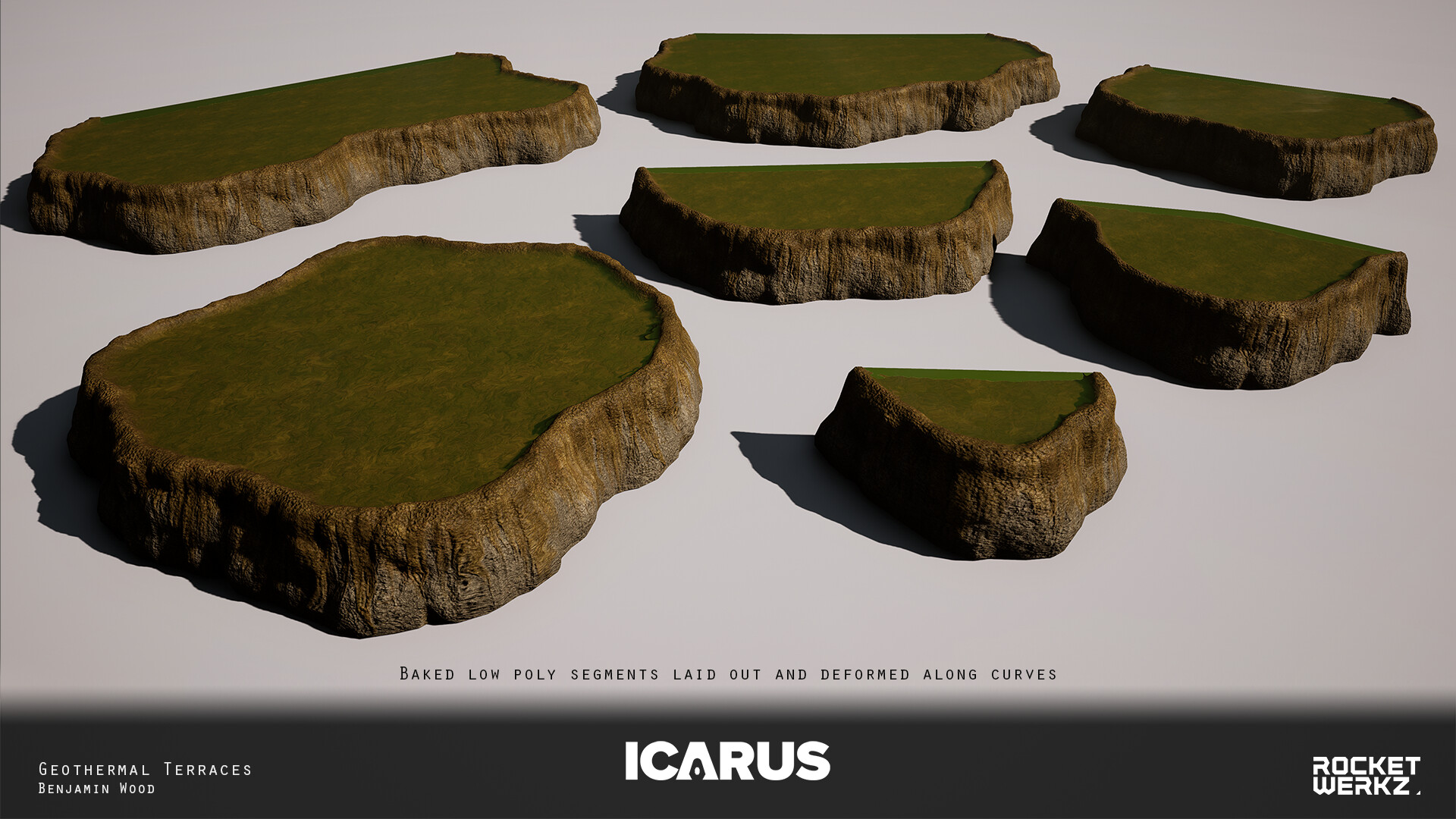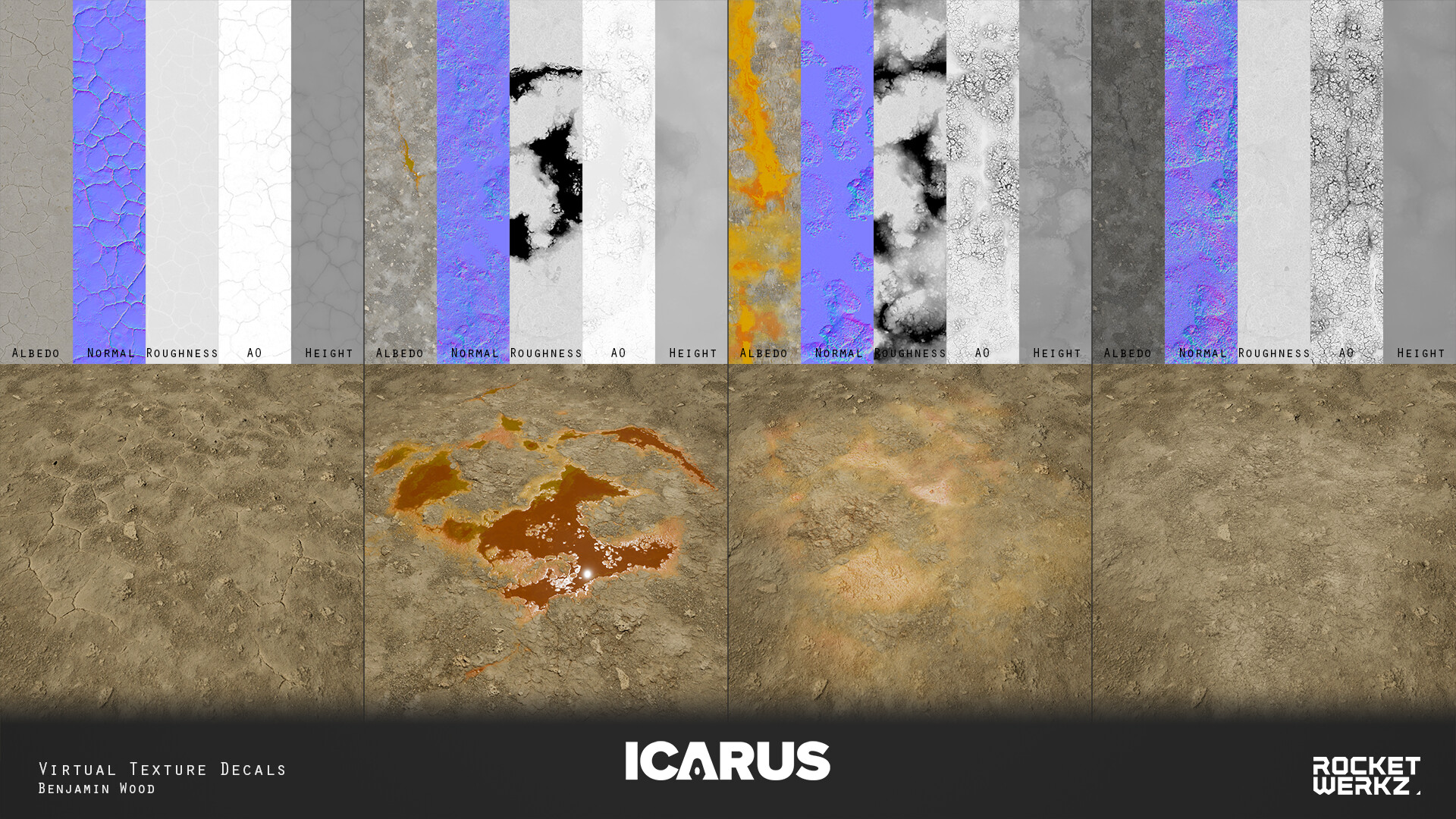 I created several different decals for adding color and visual interest to the landscape, particularly for the geothermal biome. These get painted down as instanced foliage which then get written into the landscape RVT.